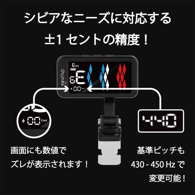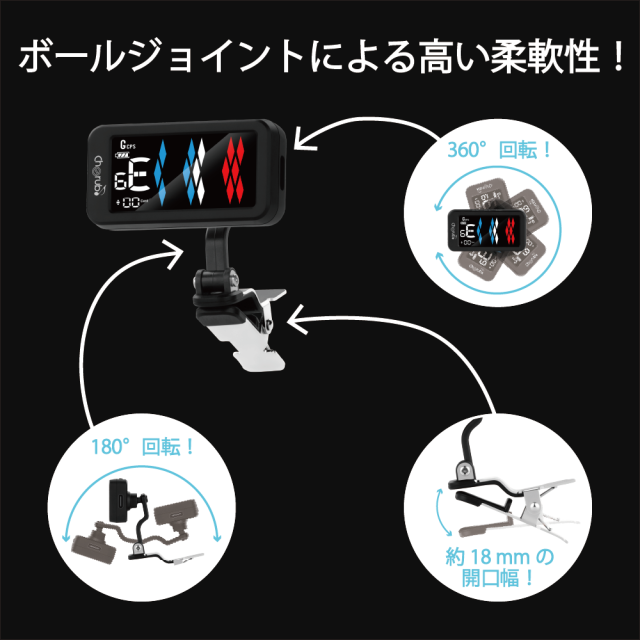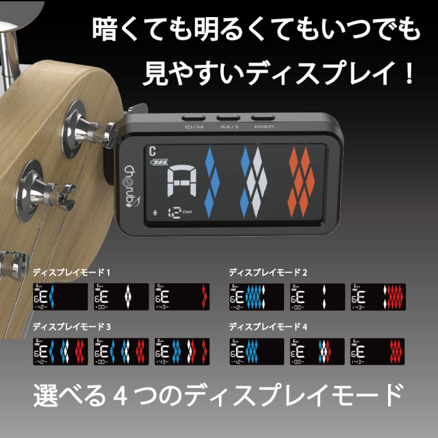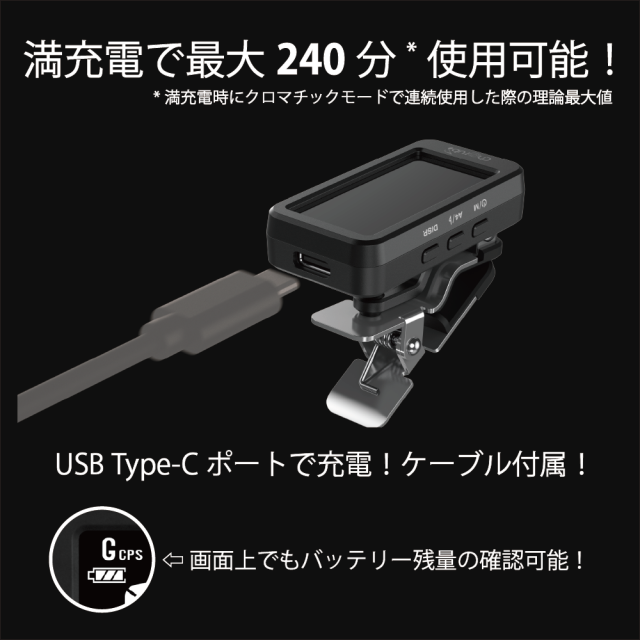 4つディスプレイモードとCPS*チューニングモードを含む5つのチューニングモードを搭載した充電式クリップチューナー
