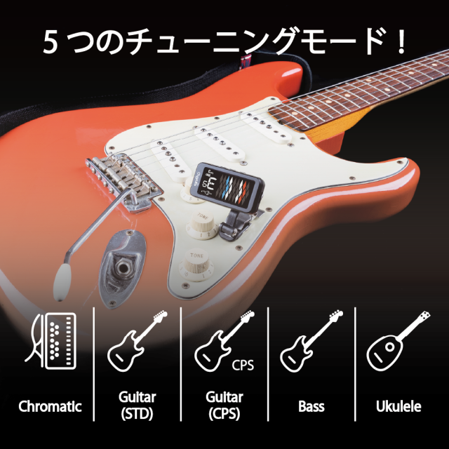 5つのチューニングモードを搭載(クロマチック、ギターSTD、ギターCPS* 、ベース、ウクレレ)