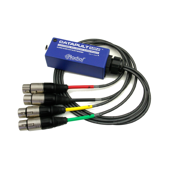 Radial Catapult Miniは、Cat5イーサネットケーブルを使用して、4チャンネルのマイクおよびラインレベルの信号を伝送するモジュラーシステムです。PA現場でのオーディオスネークのような使い方をはじめ、建物に既設のCat5配線を利用することで離れた部屋へのオーディオ伝送を簡単に行うことができます。